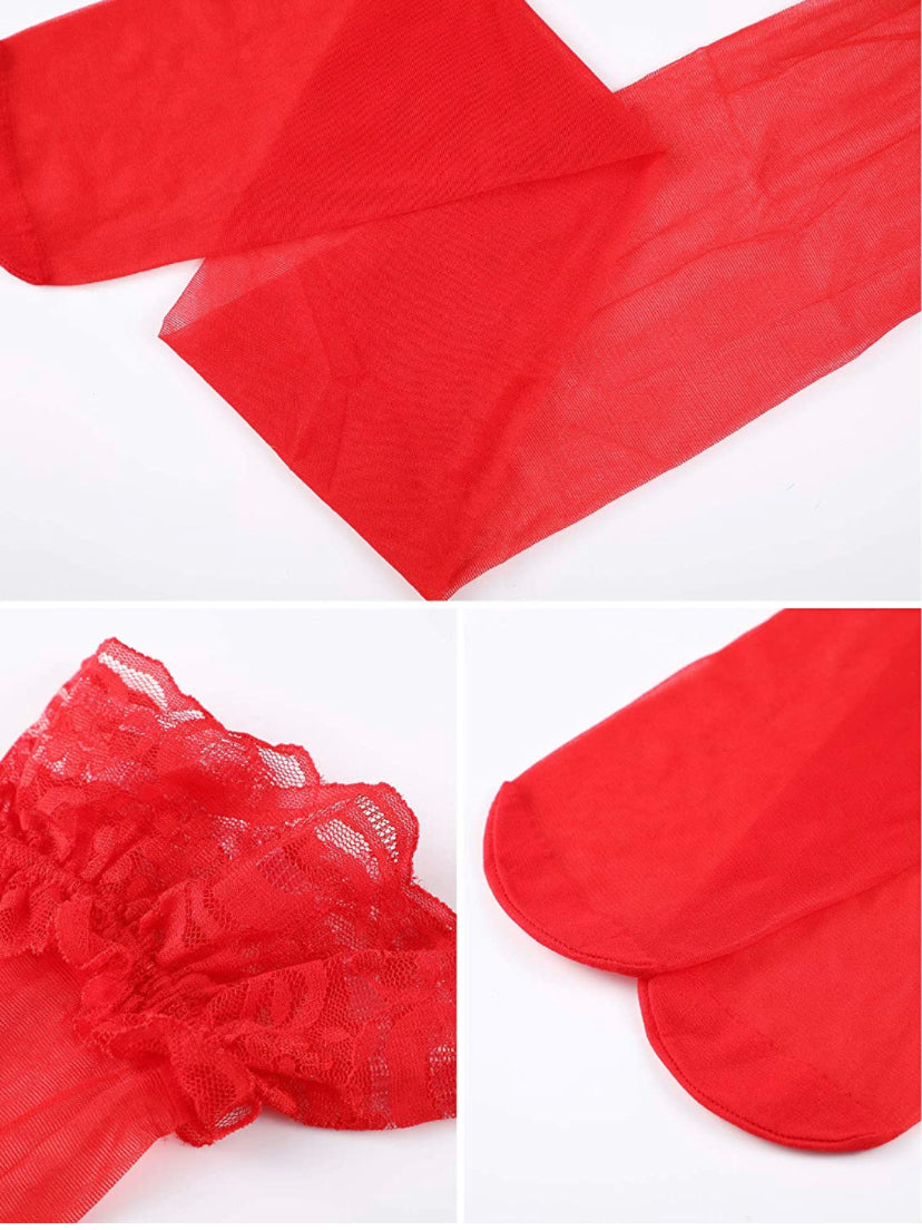 Complete your look with our beautiful thigh high lace top stockings in red or black.